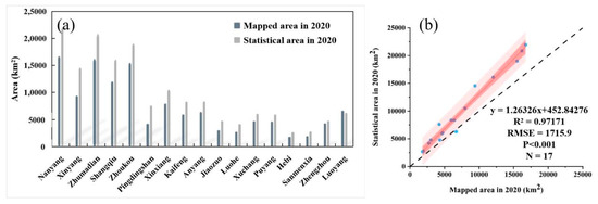 We also compared the crop statistics of cities (including 17 cities in total) in the Henan Province with our results (Figure 8). There is a significant linear relationship between the sown area derived from our results and the sown area derived from the statistical data (slope = 0.7692, R2 = 0.9717, p < 0.001, RMSE = 1715.9 km2). The sown area was smaller in the cropping intensity maps than in the national statistical data for almost all cities, mainly because the cropland area was smaller in FROM-GLC10 than in the national statistical yearbook.