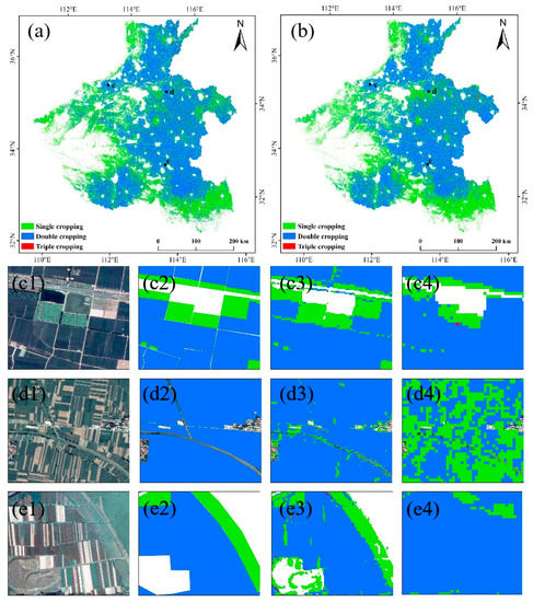 (a) Classification results of this paper. (b) Liu et al. (2020b) classification results. (c1–e1) Google Earth image. (c2–e2) Reference data by visual interpretation based on Google Earth image. (c3–e3) Classification results of this paper. (c4–e4) Liu et al. (2020b) classification results. Image source: Image 2021 CNES/Airbus. Color composite: RGB (red, green, blue).