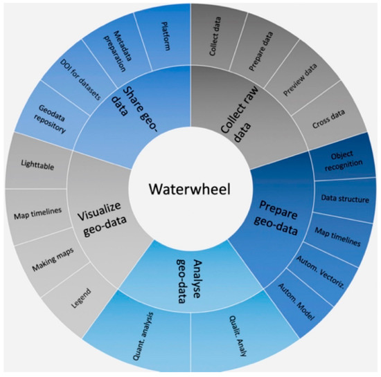 Historians and scholars, in the digital humanities, have started designing historical data and information systems for a variety of tasks, including debating within scientific communities and producing new knowledge. They are currently focused on decisions regarding how to treat the data and on the information life cycle. The WaterWheel, proposed by Hein et al. [7], summarizes the findings from the Digital Humanities Group of the Delft University of Technology, who studied the design of an information system based on paper archives, to study the past and current dynamics of a port city. The authors analyzed the information life cycle and identified a wheel of successive steps that need to be taken by different groups as illustrated on Figure 1. The wheel refers to producing and processing raw data, and distributing the newly generated data, so that they can become a new source for other groups. The concept of the wheel speaks to the need for an agile methodology to facilitate mixed-method work in the digital humanities, where historic archival research is integrated with big data approaches, and where geospatial mapping of the past is linked to the design of the future. Such a circular approach has the potential to knit together the past, present, and future, as well as multiple disciplines.