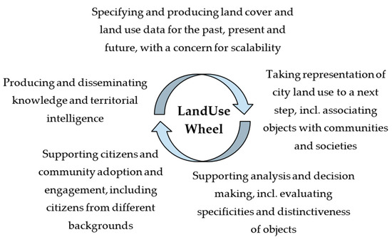 A key technology for the LandUseWheel is the capacity to achieve scalable and expressive land data models. A recurring issue in land data models is the lack of ability to partition space, in order to generate portions that will be homogeneous in terms of land cover. Homogeneity can be considered at the level of one portion of space (one area). State-of-the-art models are proposed, to account more for heterogeneities that can occur in 3D. Devos and Milenov [53] apply, to land cover models, the concept of tegon as a “horizontally homogeneous, physical spatial object with a notable spatial dimension and a specific life cycle, characterized by the presence of a substrate and possibly one or more vertical biotic or abiotic strata”. The homogeneity of the model refers to the fact that its accuracy is comparable throughout the model. Authors also investigate smarter zoning and land use concepts, to better adapt to the complexity of our cities [54,55].