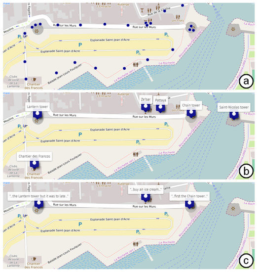 (a) Extract of a mobility track from the Geoluciole application, each point corresponds to a spatio-temporal position of a tourist visiting La Rochelle; (b) points of interest of the city from Open Data; (c) extracts of the interview corresponding to the track.