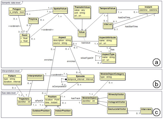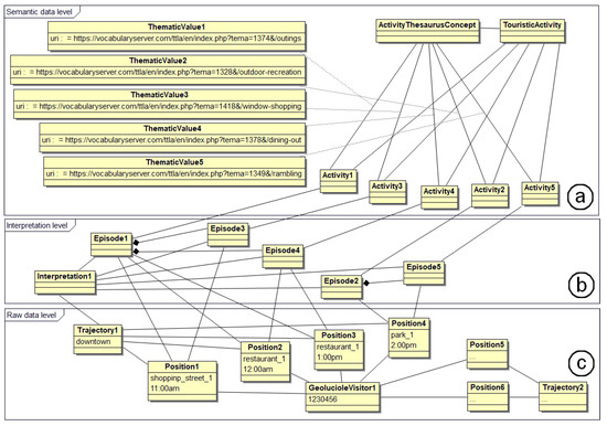 Semantic trajectory model: (a) semantic data level, (b) interpretation level, (c) raw data level.
