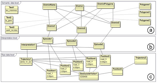 The interpretation level part (c.f. Figure 5, block b) shows what resulted from the segmentation service that created the interpretation and the episodes based on the enrichment of the positions. This step in the chain created the links between the episodes and districts and the corresponding interpretation. We could see three episodes attached to the instance Interpretation1 because the track passed through three districts at different times during the trip (i.e., Les Minimes, La Gare et Saint-Nicolas).