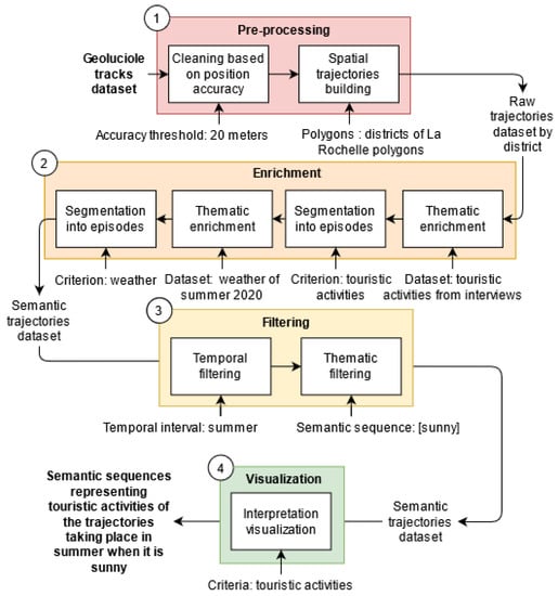First, we started from tourists’ mobility tracks, which entered a pre-processing phase (c.f. Figure 6, category 1). We were interested in the touristic activities in the different districts, therefore the construction of the trajectories was based on spatial criteria and used the zones describing the districts of La Rochelle.