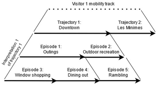 Following the segmentation based on the enrichment with touristic activities (c.f. Figure 6, category 2), we obtained an interpretation based on this criterion for each trajectory. At this stage of the project, this enrichment was done manually from data collected through interviews with tourists. Figure 7 shows the different levels of data after this first segmentation. Following the pre-processing phase, we obtained, for tourist 1, two trajectories: one took place in the district Downtown, the other in the district Les Minimes. We show only the interpretation for the downtown trajectory in Figure 7. Thus, interpretation 1 was composed of five episodes describing the touristic activities carried out by the tourist at these times. Note that episodes 3 and 4 were imbricated in episode 1 and episode 5 was imbricated in episode 2.