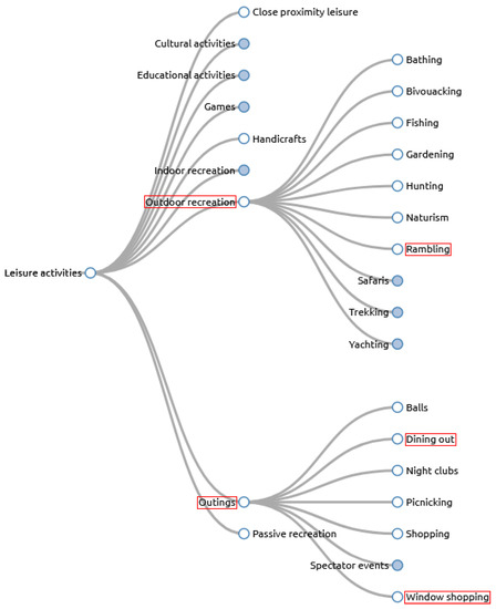 The semantic data level part (c.f. Figure 8, block a) shows the aspects Activity1, Activity2, Activity3, Activity4 and Activity5 (instances of class Aspect) each of which represented a different touristic activities. They were of type TouristicActivity (instance of class AspectType) and had as attribute a touristic activity concept ActivityThesaurusConcept (instance of class AspectAttribute). Each relation between an activity and an attribute was instantiated with the corresponding value, i.e., a concept of a thesaurus describing touristic activities that we used in the project (link to tourism and leisure thesaurus: https://vocabularyserver.com/ttla/en/index.php, accessed on 30 June 2021) (aspects Outings, Outdoor recreation, Window shopping, Dining out and Rambling). The part of the thesaurus that related to touristic activities is represented in Figure 9 and the concepts that we used in our scenario are framed in red.