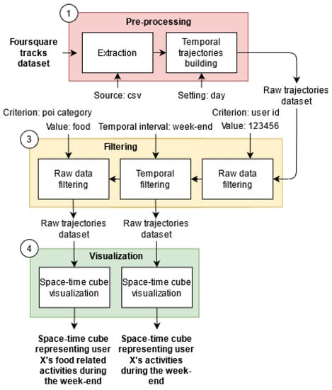 We set up the processing chain presented in Figure 10. The extraction service (c.f. Figure 10, category 1) allowed us to import source data in CSV format and to convert them to the format of our DA3T model. The following service buildt raw trajectories from mobility tracks. The question kindled our interest in the trajectories of users at the temporal scale of the day. Thus, the setting day indicated that the service built a trajectory per day and per person. Then, the filtering services (c.f. Figure 10, category 3) allowed one to retain a given user (i.e., the user with identifier 123456), their weekend mobility tracks, and the check-ins related to POI of type Food only. Finally, the chain ended with two visualization services (c.f. Figure 10, category 4) in a spatio-temporal cube: in order to analyze all the activities done by the user on all the weekends, on the one hand, and what they did in terms of catering these same weekends, on the other hand.