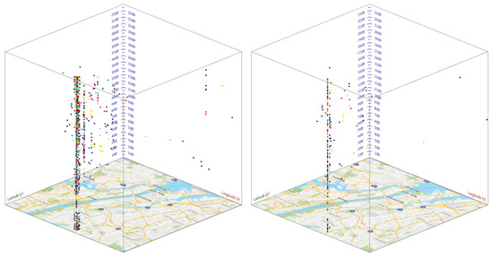 On the (left), result after the service temporal trajectories building, on the (right), result after the service thematic filtering.