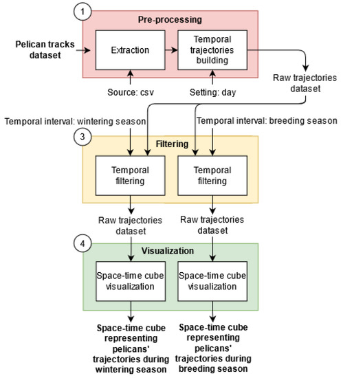 To this end, we implemented the processing chain described in Figure 12. The extraction service (c.f. Figure 12, category 1) imported the pelican tracks, source data in CSV format, and converted them to the format of our DA3T model. The following service buildt raw trajectories from the mobility tracks. The question pushed us to focus on pelican trajectories at the temporal scale of the day. Thus, the setting day indicates that the service constructed one trajectory per day and per pelican. Then, the filtering services (c.f. Figure 12, category 3) collected the tracks corresponding to the wintering period and the breeding period, respectively. Finally, for each of the two periods, the 3D Cube visualization service (c.f. Figure 12, category 4) presented the movement tracks of the pelicans concerned.