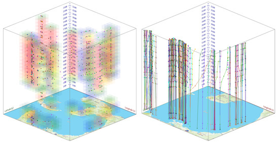 We studied the trajectories of the 81 pelicans over two remarkable periods: the wintering season (i.e., mid-February to mid-March 2014) and the end of the breeding season (i.e., August 2014). We could compare pelican behaviors during the same year (i.e., 2014) over these two time periods (c.f. Figure 13). We found that during the wintering period (c.f. Figure 13, on the left), each colony’s breeding area remained occupied throughout the day (c.f. vertical tubes). By flying over GPS positions of a particular latitude, we could see that pelicans were moving but remained broadly within the same perimeter. In contrast, at the end of the breeding season (c.f. Figure 13, on the right), we could notice two types of behavior: migrating pelicans (c.f. non-straight tracks) to other geographic areas and resident pelicans (c.f. straight tracks). Each line in the cube corresponded to the daily movement of a pelican.