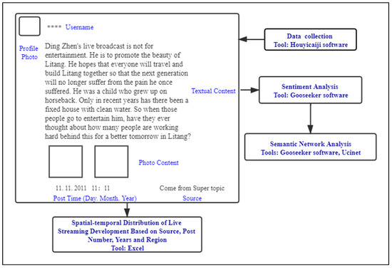 Content analysis has become increasingly popular when deriving theoretical and structural models from review data on social media [47]. The authors chose GooSeeker (https://www.gooseeker.com/, accessed on 24 April 2021), a software program used for text analysis, to perform content analysis. The analysis process included segmenting words, screening valid words, merging synonyms, generating a matching co-word matrix, and drawing network diagrams. As shown in Figure 1, the textual content, post year, and post source were considered when evaluating the spatial-temporal distribution, sentiments, and semantic network associated with live streaming.
