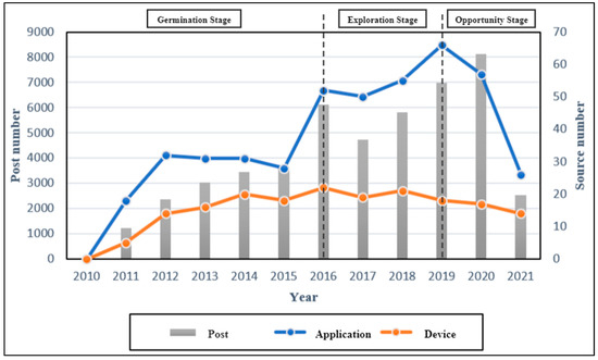 As Figure 2 illustrates, the number of posts and sources connected to Weibo rose inconsistently over time. The development of tourism live streaming over the selected 12-year period was classified into three phases. The first stage of development, labeled “germination”, occurred from 2010 to 2015. Between 3 and 32 applications were connected to tourism-related live broadcasts at this stage. Users mainly shared information on tourism live streaming from Weibo’s platform or from select browsers such as UC Browser, 360 Safety Browser, and Sogou browser. The “exploration” phase (2016–2019) included 50–66 Weibo-connected platforms. Platform- and application-specific focuses on live streaming emerged during this period. However, the potential promise of economic benefits and social prestige led to distorted content and illegal behavior as shown on some platforms. The Central People’s Government of the People’s Republic of China [50] soon started to intervene in illegal online streaming platforms, which halted the swift growth of applications and live streaming activity on Weibo. The third phase, from 2020 to present, reflects the “opportunity” stage of tourism live streaming. The pandemic and travel restrictions ravaged the tourism industry; in the meantime, live streaming became an industry breakthrough as users sought excitement from live streams and bought travel-related products (e.g., airfare and hotel reservations).