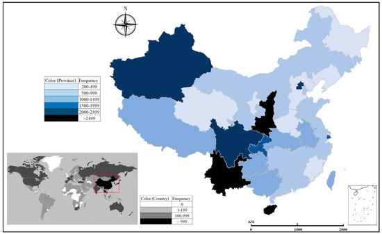 Regarding the spatial distribution of live streaming, 147 countries and 34 Chinese provincial administrative regions were detected in textual content (Figure 3). Although Weibo is a Chinese social media platform, live content covered countries in Asia, Europe, Africa, Oceania, and North and South America. In addition to China, Japan, Thailand, and South Korea were mentioned as live travel destinations more than 1000 times. The Maldives, Russia, Britain, Singapore, Canada, Denmark, Germany, New Zealand, Australia, Italy, Turkey, Switzerland, France, Vietnam, Malaysia, South Africa, the Netherlands, Spain, India, and Cambodia were also popular destinations in live broadcasts; each was mentioned more than 100 times. Some countries that are far from China or have undeveloped tourism infrastructure were rarely or never mentioned in tourism live streaming.