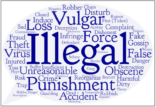 Keyword analysis of negative sentiment posts (Figure 4) highlighted “illegal” (n = 384), “punishment” (n = 179), and “vulgar” (n = 111) as the top three reasons for a negative image. The negative impact of live broadcasting therefore stemmed from illegal activities, not from travel itself. In most cases, travel activities and live broadcasting presented through social media generated a positive image: the cognitive network of live streaming tourism identified in this study was mainly based on positive and neutral posts.