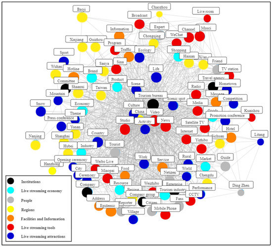 The authors pinpointed seven dimensions covering 99 elements (among the top 100 elements with the highest word frequency) within the most central connections (see Figure 5). These nodes were at the center of the semantic network and were closely connected. Six elements pertained to institutions, nine pertained to the live streaming economy, nine pertained to people, 20 pertained to regions, nine pertained to facilities and information, 22 pertained to live streaming tools, and 24 pertained to live streaming attractions. No time-related elements were observed in the network.
