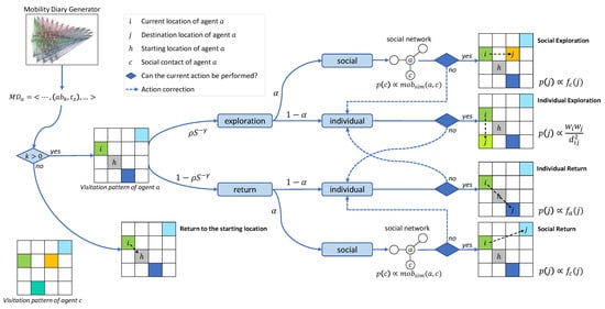 A schematic description of STS-EPR. When an agent a moves according to the entry in its mobility diary MD, if the abstract location is the individual returns to its starting location, otherwise it decides whether to explore a new location or return to a previously visited one. At that point, a determines whether or not its social contacts affect its choice for the location to visit next. If the selected action cannot be performed, it is corrected with an executable one (dashed arrows indicate action corrections).