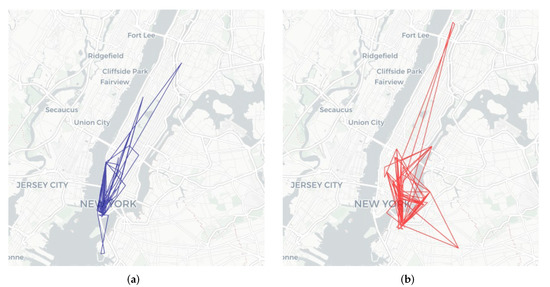 - Rossi, A.; Barlacchi, G.; Bianchini, M.; Lepri, B. Modelling Taxi Drivers’ Behaviour for the Next Destination Prediction. IEEE Trans. Intell. Transp. Syst. 2019, 21, 2980–2989. [Google Scholar] [CrossRef]