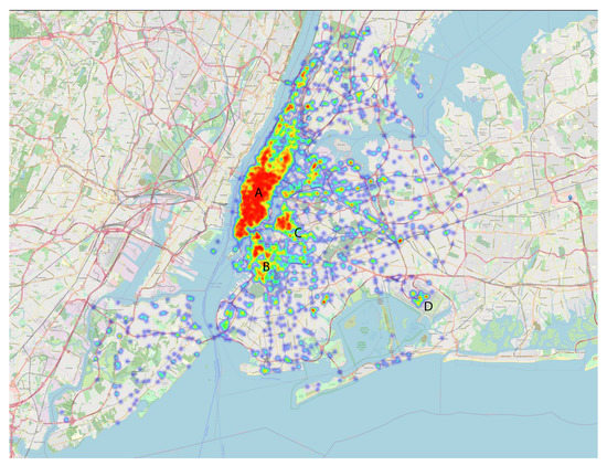 Heatmap of the positions of the 37,489 checkins made by 1001 individuals during three months (April 2012 to July 2012) in New York City. There is a high density of check-ins in Manhattan (A) and its surroundings (upper part of Brooklyn (B) and Queens (C)). The high concentration of check-ins in these areas can be explained because Manhattan is the most densely populated borough and the touristic centre of New York City, containing for example Times Square, Central Park, the Empire State Building, the Statue of Liberty, and Wall Street. As one may expect, another area of dense checkins is the JFK airport (D).
