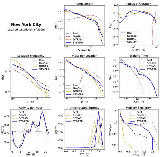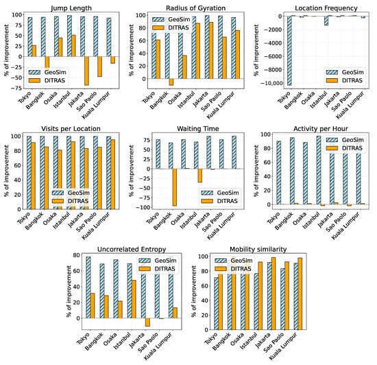 The use of the mobility diary generator is essential to generate realistic temporal patterns. GeoSim fails to capture the distribution of the waiting times (KL close to 1 in all the cities, Table 4) because it extracts the waiting times from a pre-defined statistical distribution that does not consider the characteristic waiting time associated with a particular group. The two models that use the Mobility Diary Generator (MDG), STS-EPR, and DITRAS, can better capture this distribution (Figure 4f and Figure 5f). In particular, STS-EPR achieves an average KL improvement of 76.50% and −18.87% with respect to GeoSim and DITRAS, respectively, (Figure 6e).