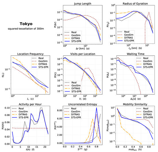 Comparison of the distribution of the mobility measures jump length (a), radius of gyration (b), location frequency (c), visits per location (d), waiting time (e), activity per hour (f), uncorrelated entropy (g), and mobility similarity (h) of real data (black dotted line) and data produced by GeoSim (red dash-dotted line), DITRAS (orange dash-dotted line), and STS-EPR (blue line), for Tokyo and the squared tessellation with tiles of 300m.