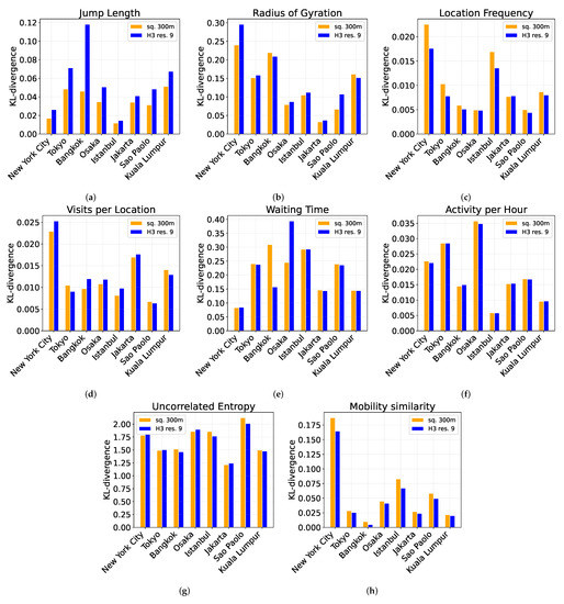 Average KL divergence of STS-EPR for jump length (a), radius of gyration (b), location frequency (c), visits per location (d), waiting time (e), activity per hour (f), uncorrelated entropy (g), and mobility similarity (h). Each group of bars indicate a city (New York City, Tokyo, London, Chicago, Los Angeles, and Madrid), each coloured bar within refers to the spatial tessellation used during the experiments.