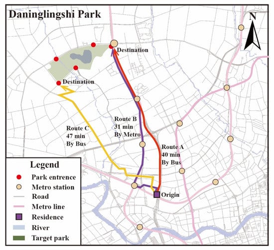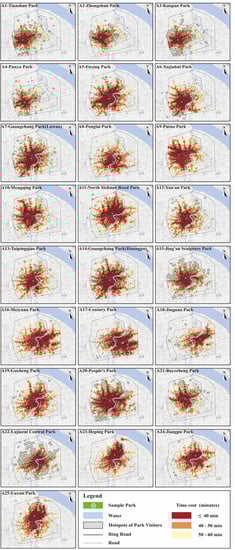 - Niu, Q.; Wang, Y.; Xia, Y.; Wu, H.; Tang, X. Detailed Assessment of the Spatial Distribution of Urban Parks According to Day and Travel Mode Based on Web Mapping API: A Case Study of Main Parks in Wuhan. Int. J. Environ. Res. Public Health 2018, 15, 1725. [Google Scholar] [CrossRef] [PubMed] [Green Version]