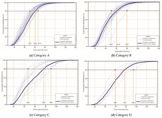 3.3. Spatial Relationship between Park Service Area and Accessibility Based on Time Thresholds
