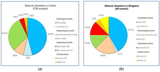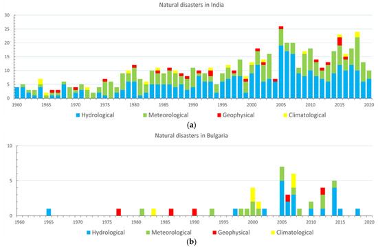 Disasters in India (a) and Bulgaria (b) for the period 1960–2020 (Data source: [60], accessed on 29 January 2021).