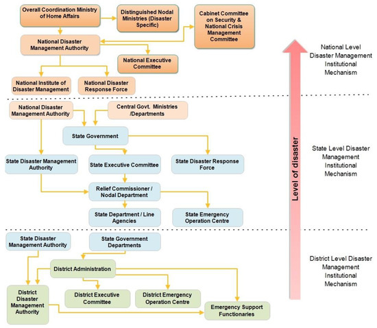 Organisational structure and responsible institutions for DRM in India. Partially sourced from NPDM, India [74] (accessed on 19 May 2021).