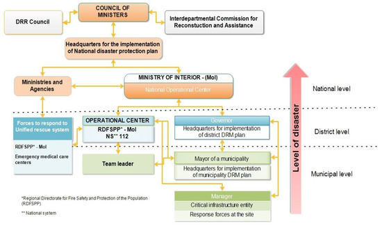 The main components of the DRM system are the General Directorate “Fire Safety and Civil Protection” (GDFSCP) at the Ministry of Interior (MoI), the regional directorates at the same Ministry, the Bulgarian Red Cross (BRC) and the first aid centres. The Council of Ministers is the responsible body for authorising emergency costs in the event of disasters. The GDFSCP is the national body responsible for DRM, while district governors and mayors are primarily responsible for disaster protection at the district and municipal levels, respectively [80,81]. The GDFSCP at the MoI is a national specialised structure responsible for performing tasks related to prevention and preparedness, management, reaction and recovery in case of disasters. The Situation Centre of the GDFSCP at the MoI conducts the overall coordination in emergencies. Operational Communication and Information Centres in all 28 districts (regions) of the country also exist. The Red Cross has developed and implements a Policy and a Strategy for actions in disasters until 2020, which will be renewed according to the approved Strategy 2030 of the International Federation of Red Cross and Red Crescent Societies.