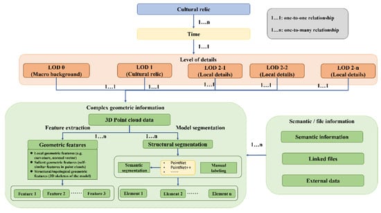 13]. Another popular 3D modeling method, named 3D GIS, is mainly used for visual display and spatial analysis of macro scenes. BIM and HBIM have been developed for 3D modeling of buildings with cultural heritage. Despite the complex geometric features that are necessary for cultural relic modeling, the damaged parts on the surface of cultural relics, such as traces of weathering, are likely to cause subtle geometric deformation, which plays an important role in cultural relic protection. Thus, with respect to the 3D digitization of cultural relics, the level of representation of geometric details is critical. Moreover, adding semantic information and knowledge to the 3D models of cultural relics can significantly expand the application range of these information models and improve the level of information acquisition for those who use the models. As such, developing an information modeling method with more comprehensive applicability is necessary to express high-level geometric details of cultural relics, and to be associated with semantic information.