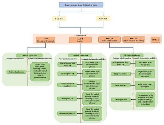 50]. It is necessary to select data acquisition methods with different spatial resolutions according to the specific application requirements. The data volume and point cloud accuracy of the model meet the needs of current research. The hierarchical LOD are divided into three levels in this framework as follows.