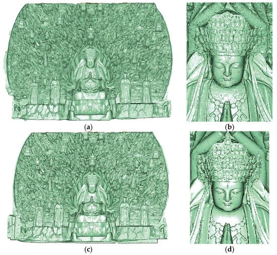 The main difference between the modeling method proposed in this paper and HBIM is based on the point cloud model. HBIM is a parametric modeling method for geometric components, and one of its purposes is to reduce the size of the model. The second difference is the parameterized expression form, which can be reused for recurring components, thus reducing the time cost of information modeling. However, the disadvantage of HBIM modeling is that, using this approach, it is difficult to accurately express geometric textures in the parameterization of complex geometric shapes. Additionally, HBIM is mainly limited to historic architecture, and cannot by easily adapted to other types of cultural relics, such as statues of various sizes. The method proposed in this article can be applied to a broader range of relics and scenarios. When using our method for modeling, it should be noted that: