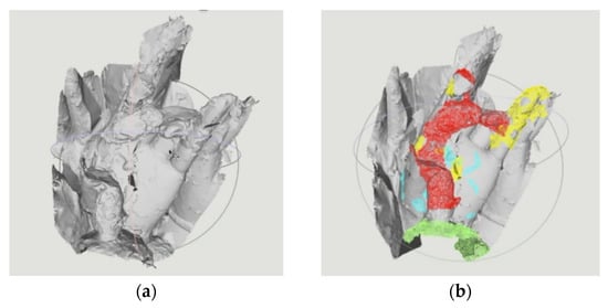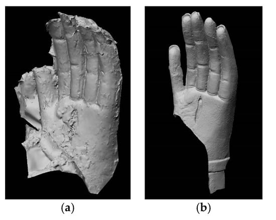 Figure 10b shows the virtual restoration result (i.e., the restoration of the damaged parts using a computer) based on the mesh model of the damaged hand. For this purpose, we used the grid editing function provided by the Geomagic Studio commercial software (