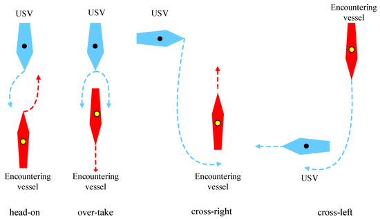 | Head-on | USV is the avoiding party: Steering right past the starboard side of the encountering vessel. | The encountering vessel is the avoiding party: Steering right past the starboard side of USV. |