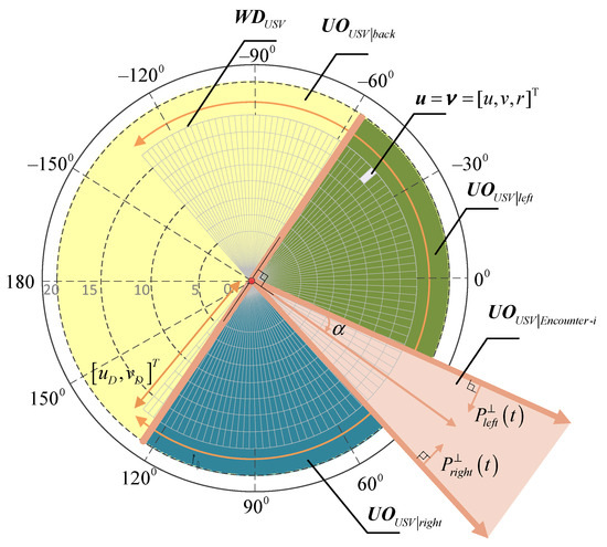 - Step 2: The velocity obstacle region of the encountering vessel is constructed according to Equation (17). The solution set of the USV turning to the left to avoid the encountering vessel and the solution set of the USV turning to the right to avoid the encountering vessel are obtained so that USV can deal with emergent threats according to Equation (18).