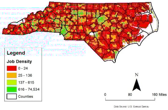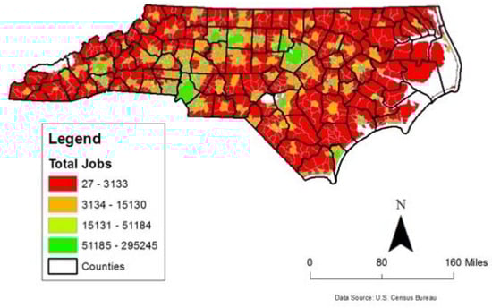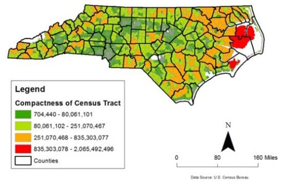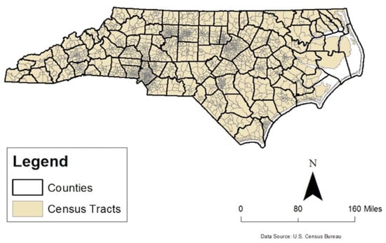 The presented study focuses on data acquired from 2157 census tracts within the USA state of North Carolina (NC). North Carolina is located along the eastern seaboard of the United States and is home to more than 10 million residents according to the most recent U.S. Census (2020 U. S. Census). Comprised of mountain, piedmont and coastal zones, North Carolina’s economy was originally agrarian in nature, which supported a large rural population. Beginning in the 1900’s North Carolina made a successful transition to a manufacturing economy (first) and more recently to a service/technology-based economy with a predominately urban population []. The State of North Carolina is divided into 100 counties and more than 500 municipalities that range in size from a few dozen to more than 800,000 residents (Charlotte, NC). The U.S. Census further divides the State into more than 2100 census tracts for statistical analysis purposes (Figure 1).