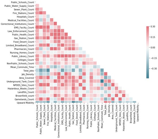 In order to better understand the effectiveness and adequacy of 28 spatial features in characterizing upward mobility, a correlation analysis is performed and the resultant correlation coefficients of all pairs of features is depicted in a color-coded plot, as in Figure 2. White encodes that the feature pair is not correlated, red indicates a positive correlation, and blue indicates a negative correlation. The darker a color, the larger the absolute correlation coefficient. For example, Figure 2 reveals that the features “Total_Jobs” and “Job_Density” are positively associated with the outcome variable “Upward Mobility”, whereas features such as “Fire_Stations_Count”, “Gas_Stations_count”, and “Area_Covered” are negatively correlated. With this plot, one can also spot a few highly correlated features that may represent similar and redundant place-based information. However, this research utilizes correlation analysis as an exploratory measure and chooses not to use correlation as a guideline for feature selection as two correlated features can still improve classification when they are in the same collection of features [].