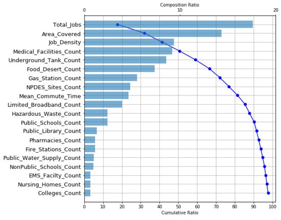 The impact of input variables on the prediction of RF model for spatial (in) justice is further explored with SHAP tool. The global importance factor of the input variables is illustrated in Figure 4. The global importance is estimated as the average of absolute Shapley values per feature across the data. The input variables are ranked in terms of importance, i.e., the higher the mean SHAP value, the more important the feature variable. As reflected in Figure 4, features such as “Total jobs”, “Area covered”, “Job Density”, “Underground Tank Count”, and “Medical Facilities Count” appeared to be the top five influential features in classifying spatially just vs. unjust places. The waterfall plot (blue line in Figure 4) also reveals that the number of total available jobs in a geographic location is the most important feature in the model, providing about 17% of the model’s interpretability, followed by the area covered by a geographic location, providing 14% of the model’s interpretability. The plot also suggests that the top 10 features provide about 85% of the model’s interpretation. It is also interesting to note that among the top ten most important features, four are from the “Economic Opportunity” category, three are from the “Basic Services” category, two are from the “Healthy Environment” category, and one is from the “Public Goods” category, as per Rocco’s characterization of Spatial Justice, depicted in Table 1. These results suggest that the model was able to learn features from most categories characterizing spatial justice and therefore has a potential to be effective in measuring spatial justice while being transparent and reliable.