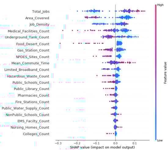 The range and distribution of impacts of input features on upward mobility predictions are also revealed through summary plots (Figure 5) via SHAP tool. Each point on the plots in Figure 5 is a Shapley value for the input variables and an instance. The y-axis indicates the input variables in order of importance from top to bottom. Each dot is colored by the value of the input variable, from low (blue) to high (red). The density of dots represents the distribution of points in the data set, i.e., whether it contains a range of values or selected ranges. Figure 5 shows that the higher values of the features “Total Jobs” and “Job Density” increase their SHAP values, and therefore push the prediction toward upward mobility (positive), on the other hand, the higher values of “Area Covered” pushes the prediction toward downward mobility (negative). These results could be interpreted such as an increase in total number of jobs at a certain census tract could potentially make it a spatially just place, on the other hand, a smaller and compact place tends to be spatially just. Similarly, an increase in “Medical Facilities Count”, “Food Desert Count”, “Gas Station Count”, and “NPDES Site Count” at a particular geographical location potentially could make the place unjust, whereas lower numbers of these spatial facilities favor spatially just places. A decrease in the number of “Underground Tank Count” certainly favors upward mobility and therefore spatially just places; on the other hand, an increase in “Mean Commute Time” enhances spatial justice.