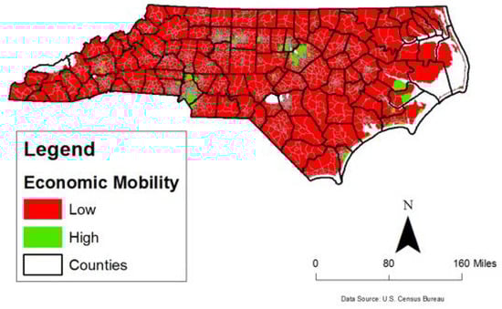 Recent academic research into economic mobility may provide an opportunity to bridge the gap that exists in the literature and begin the process of understanding the complex relationship numerous factors have on creating spatial injustices for certain communities. Reference [] highlights the importance of place on economic mobility for the poorest populations in the United States []. Specifically, Chetty et al. explored a wide variety of place-based variables and the influence they have on economic opportunity for the poorest populations. In the end, their research found that place matters. Reference [] determined that five factors are strongly correlated to these results: residential segregation, income inequality, school quality, social capital, and family structure. Several of these factors have a strong place-based component including residential segregation, income inequality, school quality, and social capital from which this study will build upon. Additionally, [] stated the need for research on the relationship between economic mobility and location at “narrower geographies” in an effort to understand the microgeographic attributes that may influence economic mobility and in turn spatial injustices.