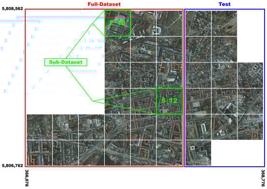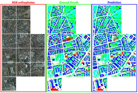 The ISPRS Vaihingen dataset was used as a second validation dataset since it supplies the necessary data for the proposed algorithm and has similar classes. Although there are some feature differences, it is another open-access dataset that has been used in many studies, like the ISPRS Potsdam dataset. The main differences are; the true orthophotos of the dataset have a combination of IRRG instead of RGB, the ground sampling distance of both true orthophoto and DSM is 9 cm, and the dataset has 33 patches with different dimensions []. Moreover, the dataset only provides DSM, therefore nDSM patches generated by [] were used in this study.