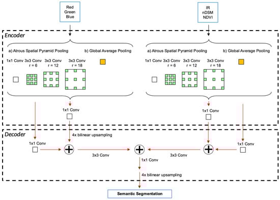Dual-stream Xception based DeepLabV3+ considered two parallel streams as encoders so as to exploit both RGB and nDSM + IR + NDVI data sets together. Atrous Spatial Pyramid Pooling (ASPP) which is utilized in the architecture is capable of encoding multi-scale contextual information. However, the main differences of dual-stream structure from the original DeepLabV3+ occur at the decoder stage. First, the decoder of the proposed model employs 1 × 1 convolutions for the extracted features from both streams and then applies bilinear upsampling by a factor of 4. In two separate streams, 3 × 3 convolutions were operated after upsampling and 1 × 1 convolutions were harnessed. Afterward, the decoder concatenated features from two streams, then applied a 1 × 1 convolution and a bilinear upsampling by a factor of 4 to extract final semantic segmentation images.