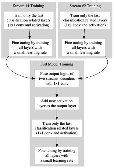 Many traditional CNN architectures such as FastFCN, Gated-SCNN, DeepLab, Mask R-CNN [,,,] focus on semantic segmentation of ordinary RGB images which have comprehensive daily life contents. Also, the traditional CNN architectures are not initially considered for multi-modal data such as multi-spectral orthorectified images, spectral indices, and three-dimensional digital terrain models in EO applications. Therefore, semantic segmentation of remote sensing data requires optimized architectures so as to extract geospatial objects precisely. When the noteworthy semantic segmentation algorithms [] having the potential to specialize in geospatial data are considered, DeepLabV3+ [] stands out as a state-of-the-art CNN which is able to obtain sharper object boundaries by adding a decoder module to DeepLabV3 []. Moreover, DeepLabV3+ is capable of maintaining the rich contextual information from the encoder part. Although the DeepLabV3+ model has achieved great success in semantic segmentation in recent years, there is still a need for multi-stream architectural approaches of the model that can leverage multi-modal geographic datasets. Besides customizing the architecture, the effect of different training approaches on semantic segmentation performance should also be scrutinized. One of the main problems considering geospatial data classification can be expressed as the lack of high-resolution remote sensing benchmark and uncertainty in the quality of the existing datasets such as shadow effects, orthophoto distortions, and ground truth errors. Another important point is that there is no standard for patch size and it has a significant effect on the results as mentioned in []. Furthermore, two issues stand out, especially in the handling of geospatial data. The first is the determination of the optimal fusion phase and the other one is the usage of scale-variant data. The approaches mentioned here should be considered to provide a balance between accuracy and computational load.