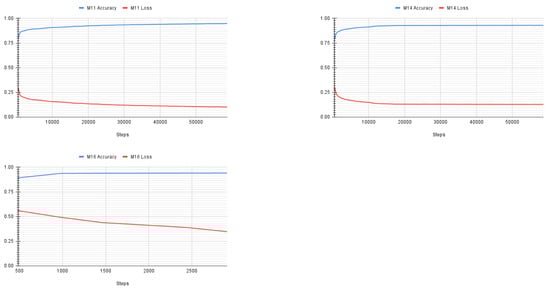Potsdam models M11, M14, and M16 training accuracy and loss.