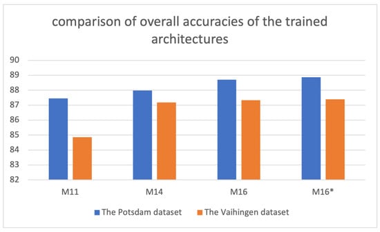 As seen in Figure 7, the test results were evaluated from the models obtained by training Potsdam and Vaihingen datasets on the related architectures. Accordingly, it is understood that the model results show a compatible performance in different datasets. On the other hand, it is observed that the Vaihingen data set produces relatively less accuracy. In addition, in other related studies, it is also seen that the Potsdam dataset provides better accuracy than the Vaihingen dataset. This is considered to occur due to the lower spatial resolution of the Vaihingen dataset.