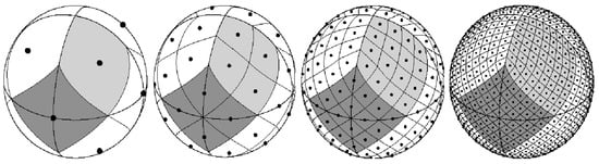 The geodesic grid used to support the multi-class categorization objective is built through the Hierarchical Equal Area isoLatitude Pixelization (HEALPix (http://healpix.sourceforge.io (accessed on 10 November 2021))) scheme, proposed by Górski et al. [25] and used in previous studies related to document geo-coding [44]. In brief, the HEALPix algorithm partitions a spherical representation of the Earth’s surface, generating cells of equal area related to distinct regions. The partitions are collected hierarchically from recursive divisions, and the number of recursive divisions to execute (i.e., the desired resolution) can be defined by the user. The partitioning scheme is demonstrated in Figure 1, which shows the grid resulting from divisions related to multiple resolution parameters, with differences in the number of cells that are generated. The number of generated regions (i.e., cells in the geodesic grid) is defined according to Equation (2), where the is related to the aimed resolution.