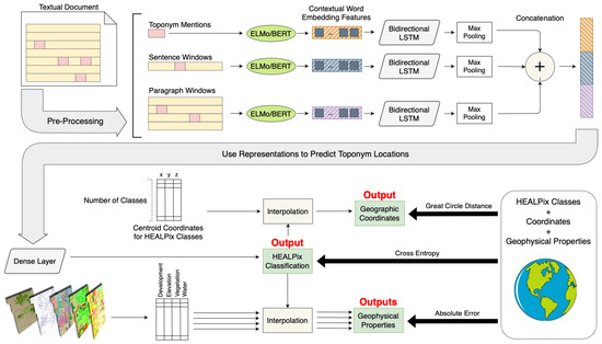 The model that we are proposing combines multiple textual inputs, more specifically the place name reference, the sentence where the reference occurs, and the corresponding paragraph. The model also considers multiple outputs that are connected together, particularly a primary output corresponding to geographic coordinates, together with an alternate classification output related to coarse regions on the earth’s surface (i.e., the model combines a multi-class classification objective, associated with predicting regions, together with a regression objective associated with predicting latitude and longitude coordinates). The classification regions are established using a Hierarchical Equal Area isoLatitude Pixelisation (HEALPix) [25] method that generates equal area cells, obtained by partitioning a spherical surface representing the earth’s surface recursively. The network output corresponding to geo-spatial coordinates, which derives its values from the probability distribution associated with the classification output, is connected to a loss function corresponding to the great circle distance. This value is combined with a cross-entropy loss for the multi-class classification output, jointly optimizing both parts to hopefully improve the prediction of the geographic coordinates for each place reference. Additionally, we experimented with the use of information corresponding to geophysical properties (i.e., the elevation, the development of the terrain, the minimum distance from water zones, and the percentage of vegetation), in an attempt to further improve performance. This additional information is derived from external datasets and integrated in the model, as additional regression outputs, to guide the prediction of the geographic coordinates with basis on the descriptions given in the surrounding context.
