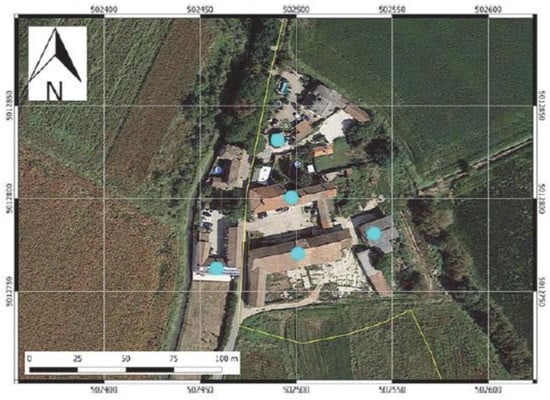 Identification of buildings from a reference database (overlap of Google maps (image) and OpenStreetMap (point) features): an example from Trivolzio, Pavia, Northern Italy (Franzini et al., 2020).