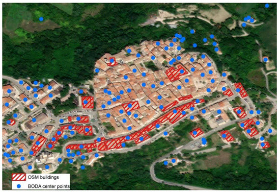 An example of BODA building centroid overlay on OSM building database for the municipality of Frosolone, Molise (Southern Italy).